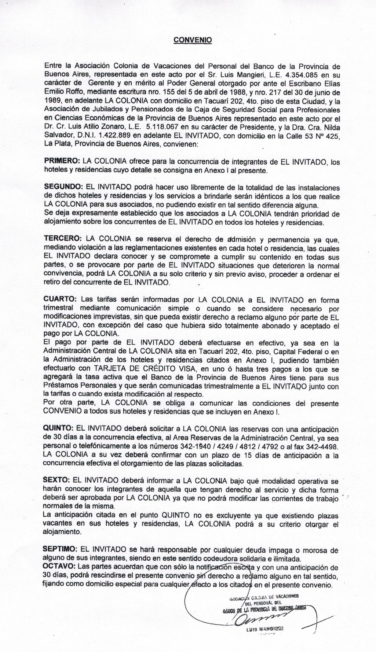 Primero: La Colonia (Asociación Colonia de Vacaciones del personal del Banco provincia de buenos aires) ofrece para la concurrencia de integrantes de El Invitado (Ajupce), los hoteles y residencias.